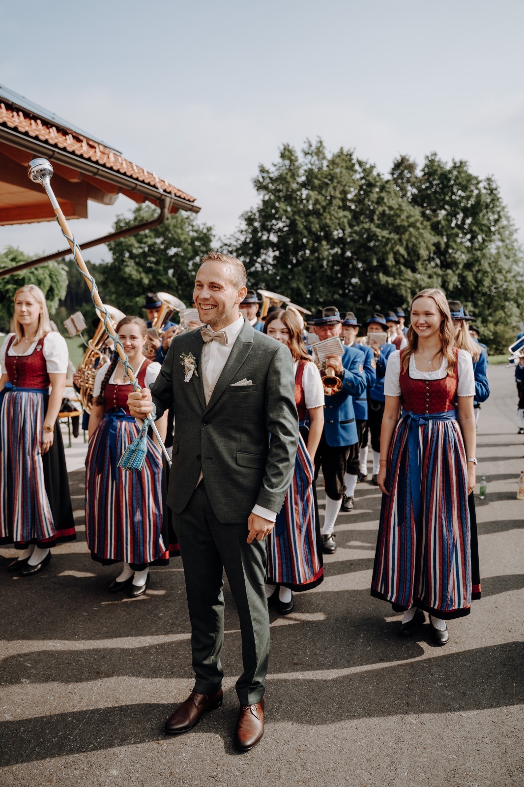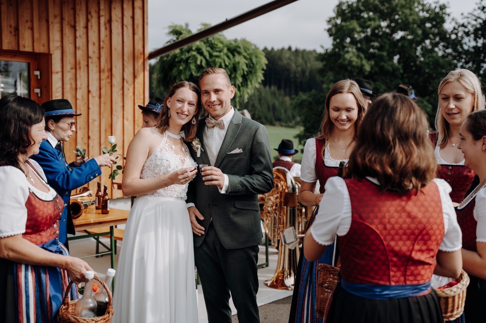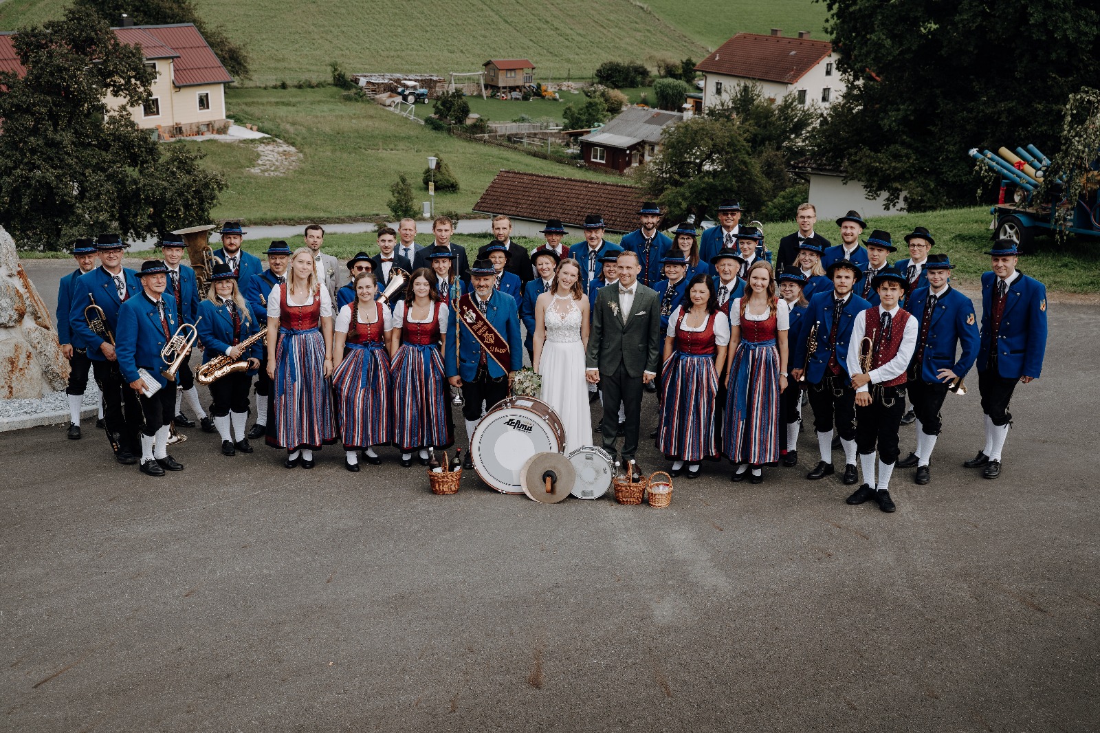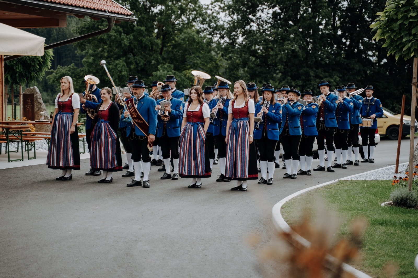Am Samstag, 13.09.2025, durften wir Teil der Hochzeitsfeier von unserem Trompetenspieler Matthias und seiner Frau Theresa sein. Zuerst durften wir das Brautpaar mit seinen Gästen musikalisch begrüßen und im Anschluss an die kirchliche Trauung sorgten wir bei der Agape und dem klassischen "Absperren" für die musikalische Umrahmung.